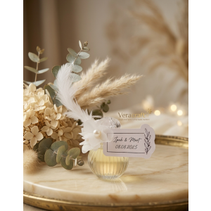 Bohem ve Şık Tasarım Şişe kapağında yer alan yumuşak tüy detayları, kişiye özel kolonya şişesi tasarımına bohem ve lüks bir hava katıyor. Gümüş veya altın varaklı isimli etiket seçenekleriyle tamamen size özel hale getirilen bu ürünler, söz nişan hediyeliği kategorisinde en çok tercih edilen trendler arasında yer alıyor.